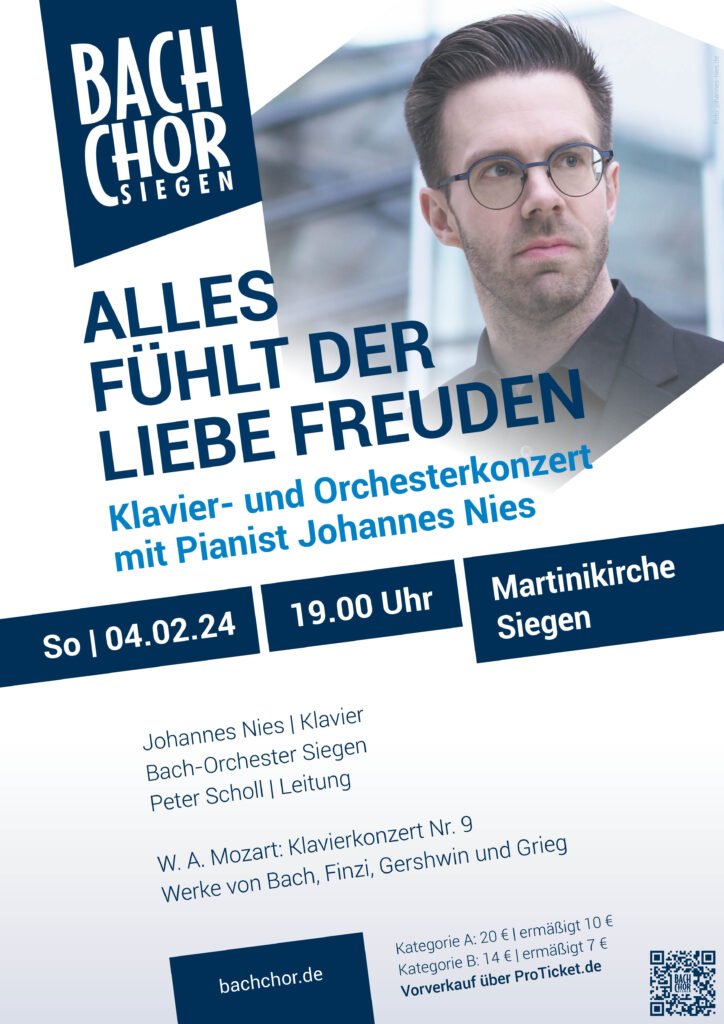 Am Sonntag, den 04.02.24 ist der Pianist Johannes Nies zu Gast bei uns. Gemeinsam mit dem Bach-Orchester spielt er u.a. das Klavierkonzert Nr. 9 von Wolfgang Amadeus Mozart. Warum er dieses Stück liebt und wie er überhaupt zur Musik gekommen ist, erzählt er im Interview mit unserem Chorleiter Peter Scholl.