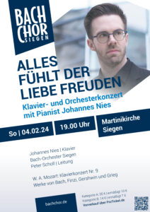 Am Sonntag, den 04.02.24 ist der Pianist Johannes Nies zu Gast bei uns. Gemeinsam mit dem Bach-Orchester spielt er u.a. das Klavierkonzert Nr. 9 von Wolfgang Amadeus Mozart. Warum er